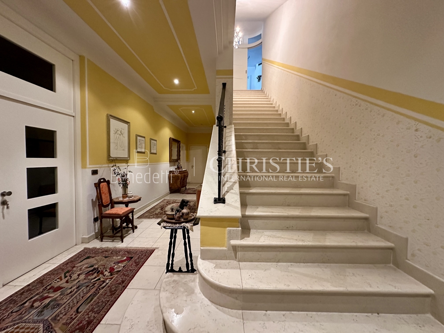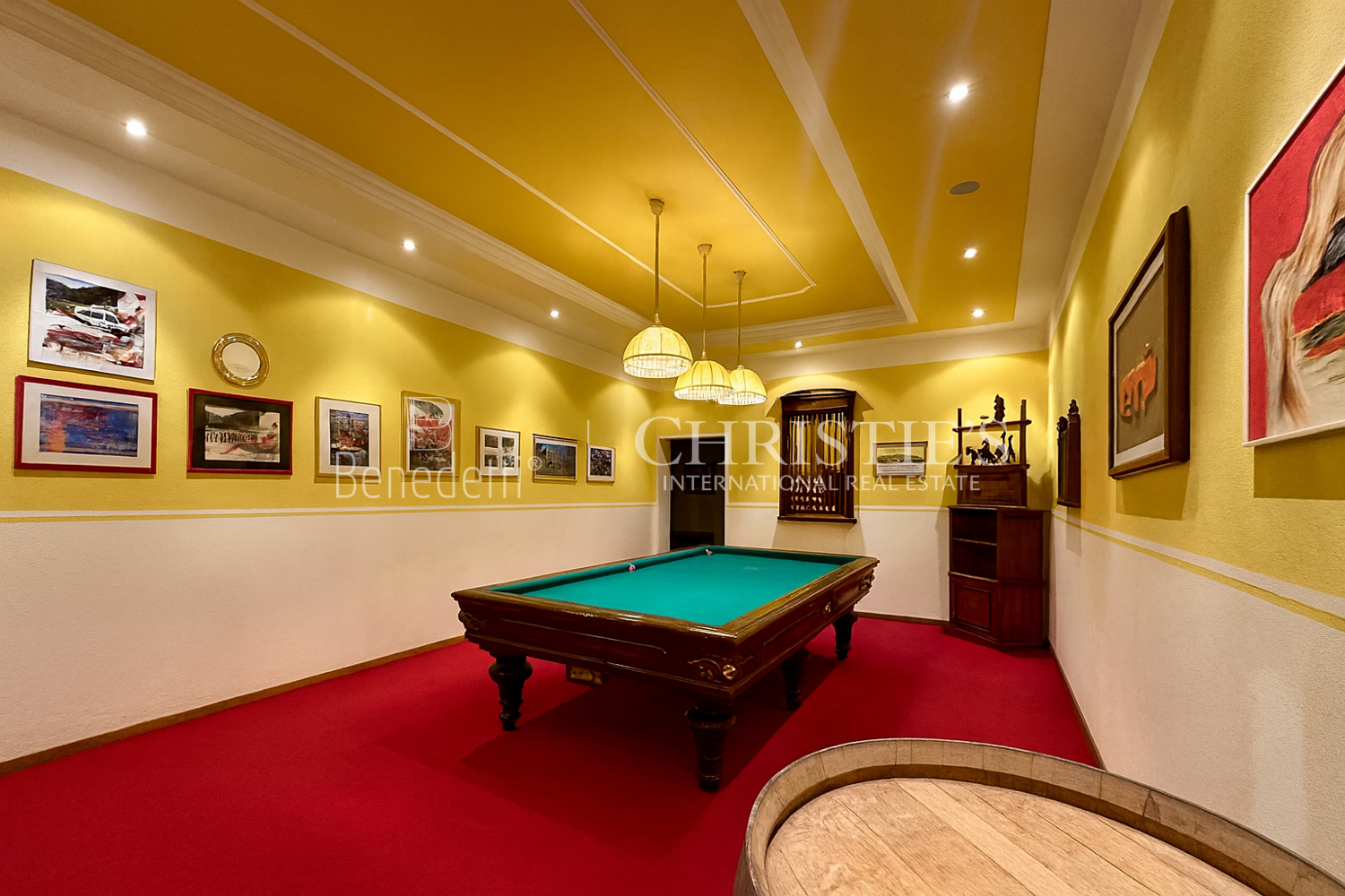 Mit einer oberirdischen Brutto-Wohnfläche von ca. 590 m² und einer unterirdischen Bruttonutzfläche von ca. 1.055 m² erstreckt sich dieses Anwesen über vier Etagen, verbunden durch einen Aufzug von der Garage bis ins Dachgeschoss. Im Erdgeschoss, vor der Eingangstür befindet sich eine Einliegerwohnung mit separatem Zugang – ideal für Gäste oder Personal.