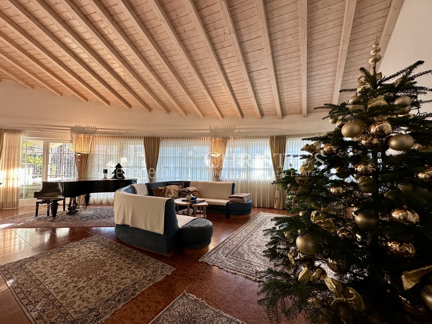 Durch die großen Glasfronten öffnet sich der Blick in den wundervollen Garten mit Seerosenteich, Outdoor-Pool und überdachter Terrasse – ein Ort der Ruhe, des Genusses und der Inspiration.