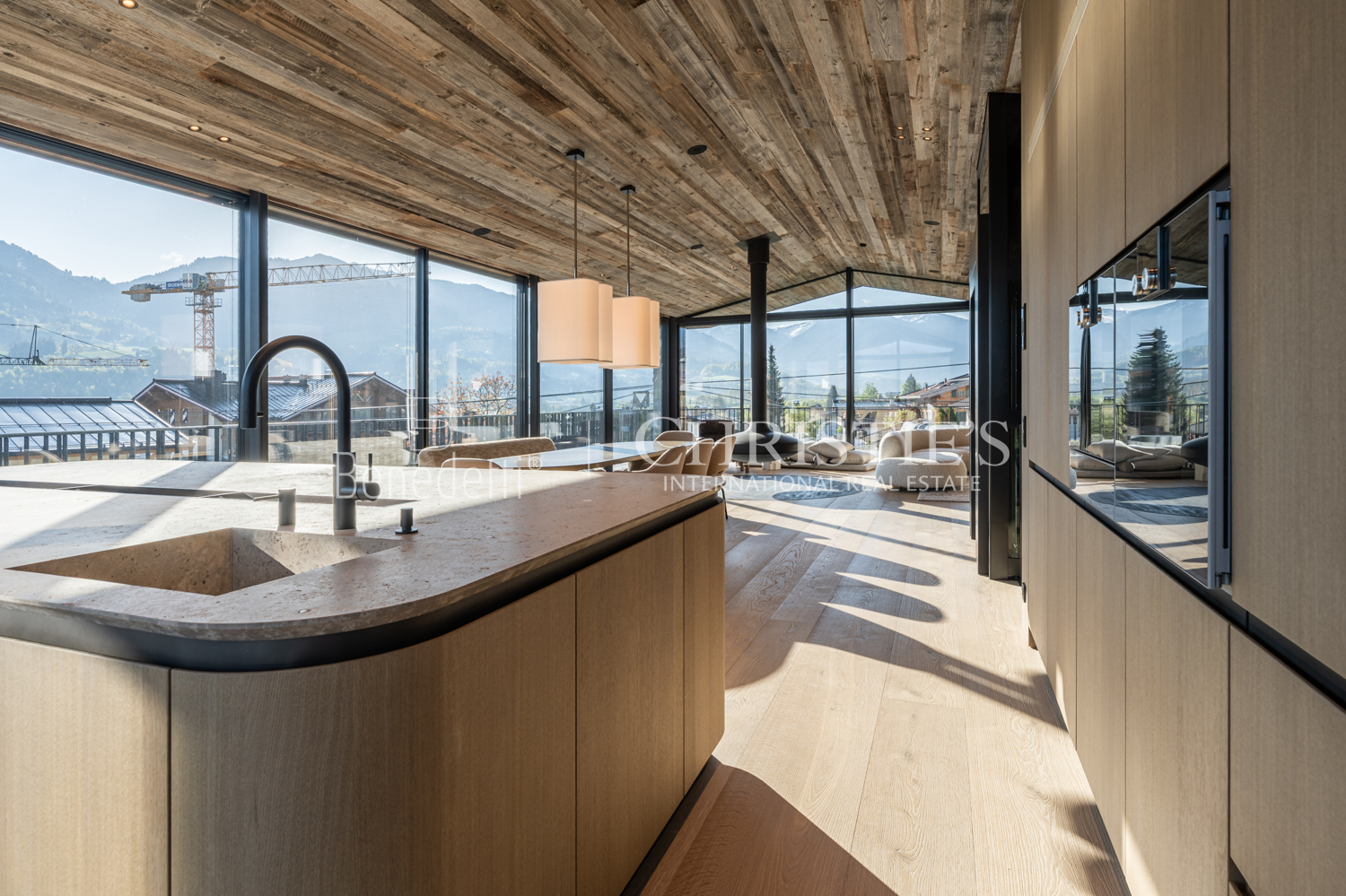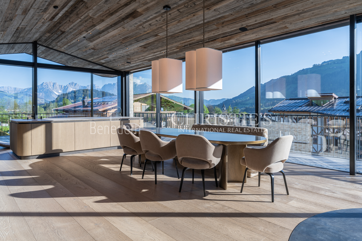 Der grandiose Wohnbereich mit raumhohen Fensterfronten eröffnet ein Panorama, das seinesgleichen sucht: Das Kitzbüheler Horn und der Wilde Kaiser erscheinen wie ein Kunstwerk, das sich mit dem Tageslicht verwandelt. Der schwebende Gyrofocus-Kamin setzt einen spektakulären Akzent und verleiht dem Raum eine einzigartige Aura.