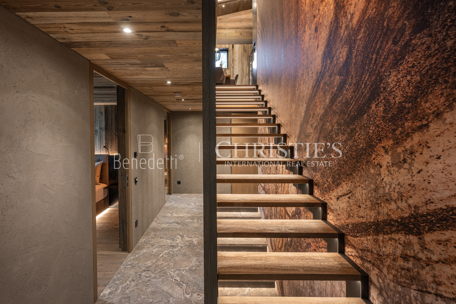 Das Chalet erstreckt sich über zwei Ebenen – Erdgeschoss und Dachgeschoss – und wurde konzipiert, um zu jeder Jahreszeit ein anspruchsvolles und funktionales Wohnerlebnis zu bieten. Der Eingangsbereich führt in einen praktischen Raum zur Aufbewahrung von Skiern, Skischuhen und Fahrrädern, ausgestattet mit Waschmaschine und Trockner, ideal für Liebhaber eines aktiven Berglebens.