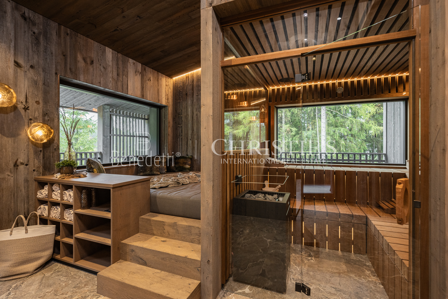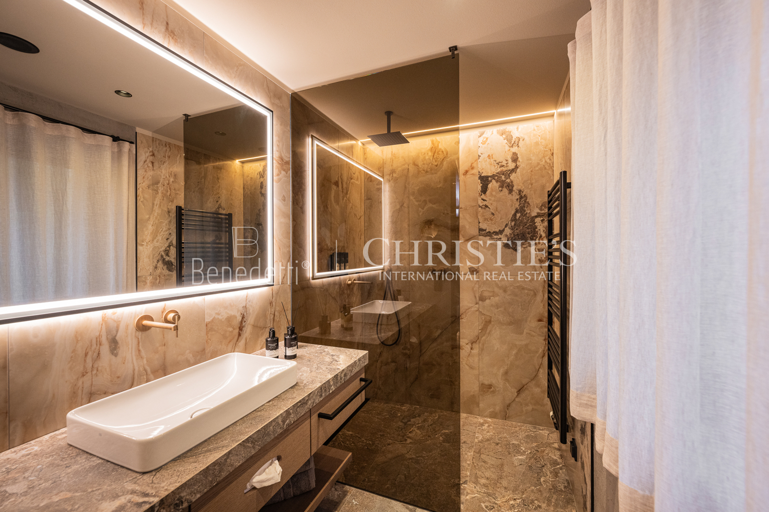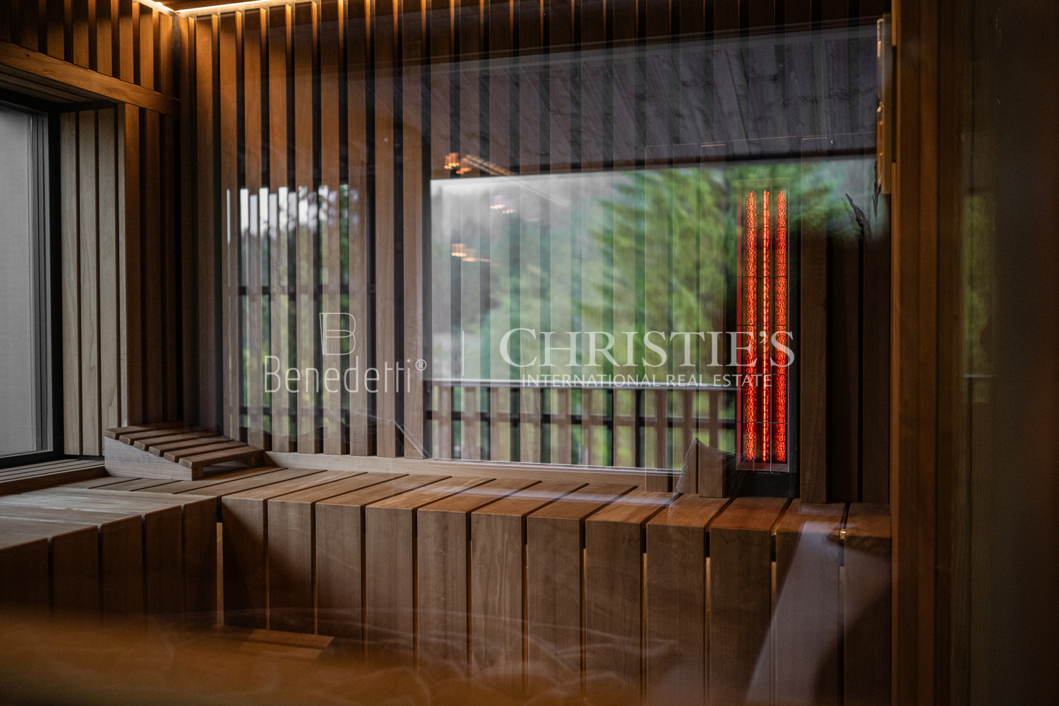 Auf der Außenterrasse bietet ein beheizter Whirlpool zu jeder Jahreszeit Momente puren Wohlbefindens. Im Innenbereich rundet der Wellnessbereich das Erlebnis ab: eine finnische Sauna, die in eine Infrarotsauna umgewandelt werden kann, eine Erlebnisdusche sowie ein Ruhebereich. Auf derselben Ebene befindet sich das Hauptschlafzimmer mit eigenem Bad; die Möglichkeit, ein versenkbares Etagenbett zu integrieren, macht es äußerst vielseitig.ieren, wodurch der Raum besonders vielseitig nutzbar ist.
