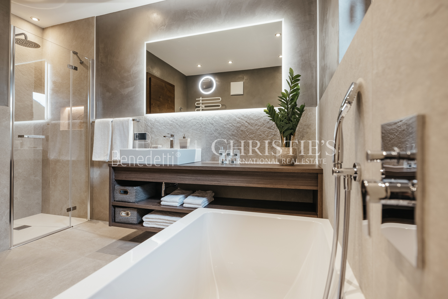 Im Erdgeschoss befindet sich ein großzügiger privater Spa-Bereich, ein wahrer Ort der Entspannung und des Wohlbefindens, ausgestattet mit einem Swimmingpool mit Hydromassage, Sauna, Ruhebereich sowie einem Servicebad für den Spa-Bereich. Auf derselben Ebene befindet sich zudem ein Schlafzimmer mit eigenem Bad. Abgerundet wird das Geschoss durch eine große Panoramaterrasse, die sowohl vom Spa-Bereich als auch vom Schlafzimmer aus zugänglich ist und ideal dazu einlädt, die alpine Landschaft zu genießen und entspannte Momente im Freien zu verbringen.