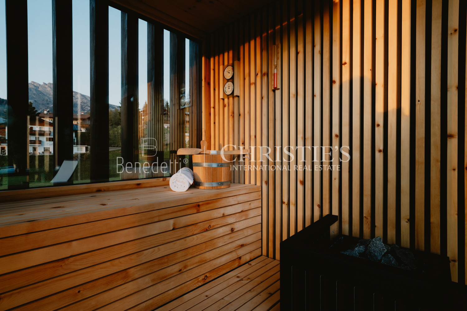 Im Außenbereich befindet sich zudem ein exklusiver privater Wellnessbereich mit finnischer Sauna und Whirlpool, ideal zur Erholung nach einem Tag auf der Piste oder auf den Wanderwegen.
