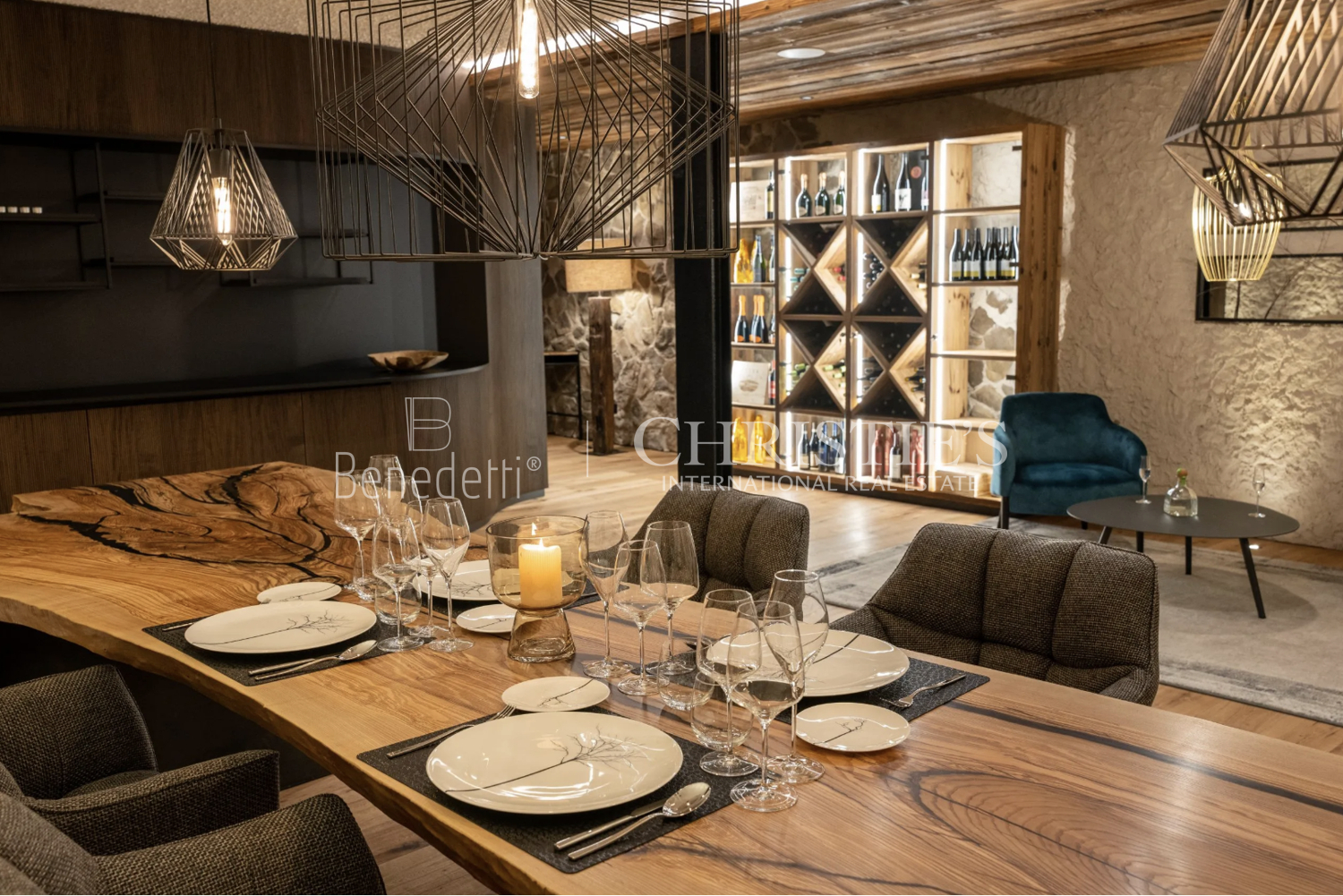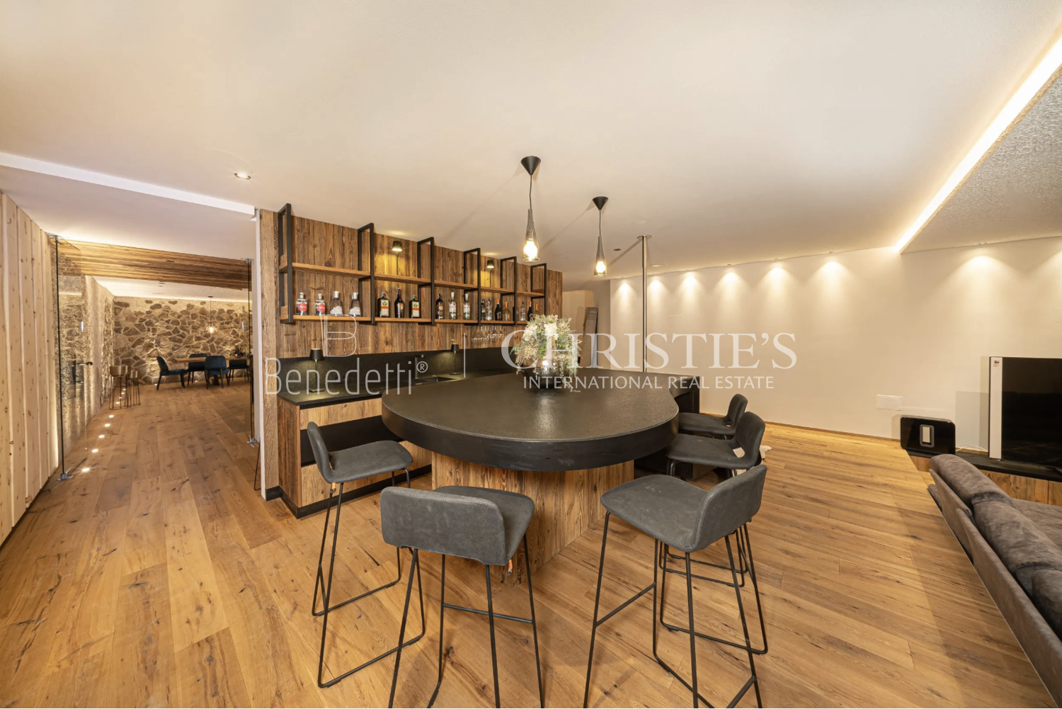 Gli spazi comuni sono ampi e luminosi: una cucina completamente attrezzata, una raffinata zona pranzo ed un elegante salotto con bar privato e tavolo da biliardo, ideale per momenti di convivialità dopo una giornata sulle piste o tra i sentieri di montagna. Ai piani superiori si trova inoltre due ulteriori soggiorni con angoli cottura sapientemente nascosti, perfetti per garantire indipendenza e comfort agli ospiti.