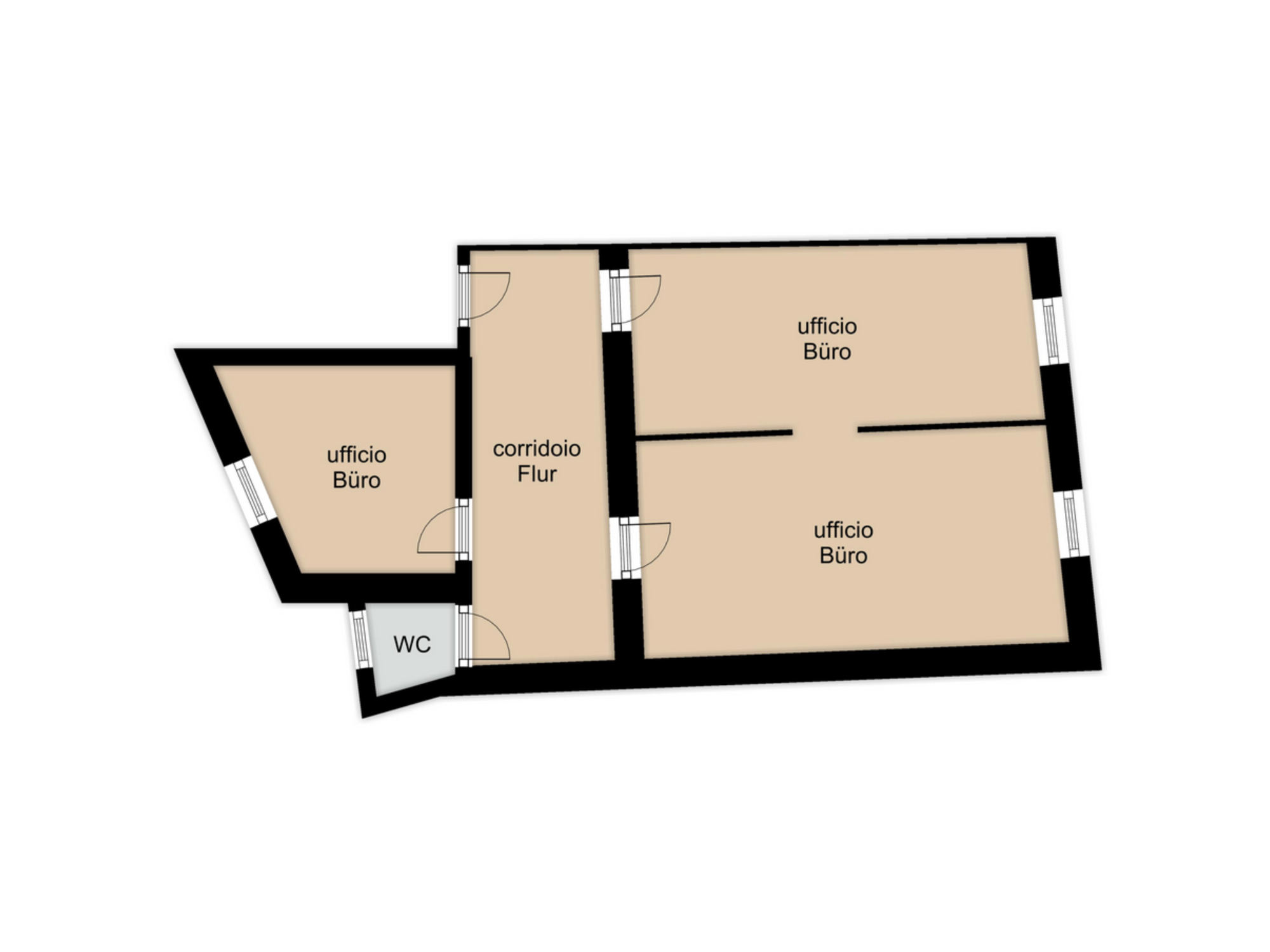 Primo piano: corridoio, tre uffici luminosi, WC