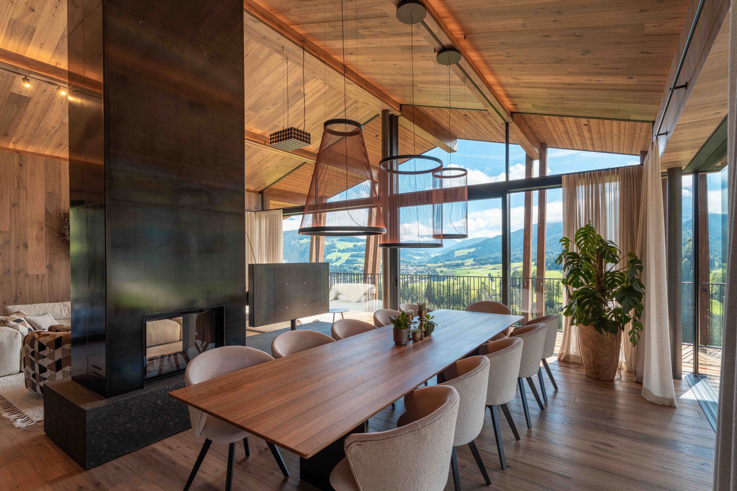 Der offene Wohn- und Essbereich mit imposanten Panoramafenstern und Kamin ist das Herzstück des Chalets – ein Ort für repräsentative Empfänge ebenso wie für private Abende in wohliger Geborgenheit. Die moderne Designerküche, ausgestattet mit hochwertigen Geräten, macht Genuss zu einem Erlebnis auf höchstem Niveau.